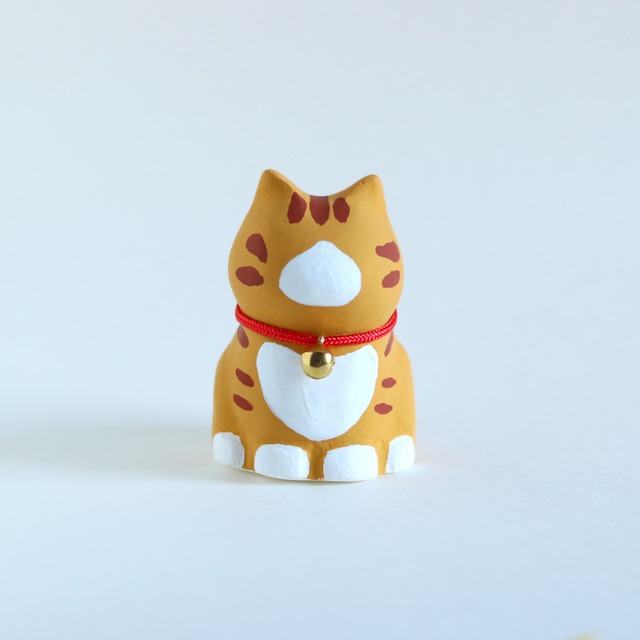 ぽってりとしたシルエットが愛らしい、茶トラ柄の猫の置物です。 同じシリーズの茶トラ白より濃いめの色。 ちょこんと座る姿は、 まるで静かにこちらを見つめているよう。 それでいて、あえて表情はつけていません。 見る人によって、 眠そうにも、甘えているようにも、 少しすましているようにも見える―― そんな“余白”を残した猫です。 型を取り、削り、磨き、塗る。 いくつもの工程を重ねながら、 ひとつひとつ丁寧に仕立てました。 そのままシンプルに飾っても、 お好きにお顔を描いて“うちの子”にしていただくのもおすすめです。 (描く場合はアクリル絵の具をご使用ください) デスクの片隅や、本棚のすき間に。 そっと寄り添う、小さな猫です。 サビ柄ちゃんは特に模様がひとつひとつ異なるランダムな着彩なので 写真と異なる場合があります。 フェルトの座布団、首輪と鈴付き。 他の柄の猫もいます。 サイズ:高さ 約6cm/よこ 約3.8cm/奥行き 約4cm 重さ:約63g 素材:石膏(本体) ※ひとつひとつ手作業のため、形や質感、細かなシワや傷の出方が異なります。 ※石膏製のため、落下や強い衝撃で破損する場合がございます。お取り扱いにはご注意ください。 ※底面は白です。