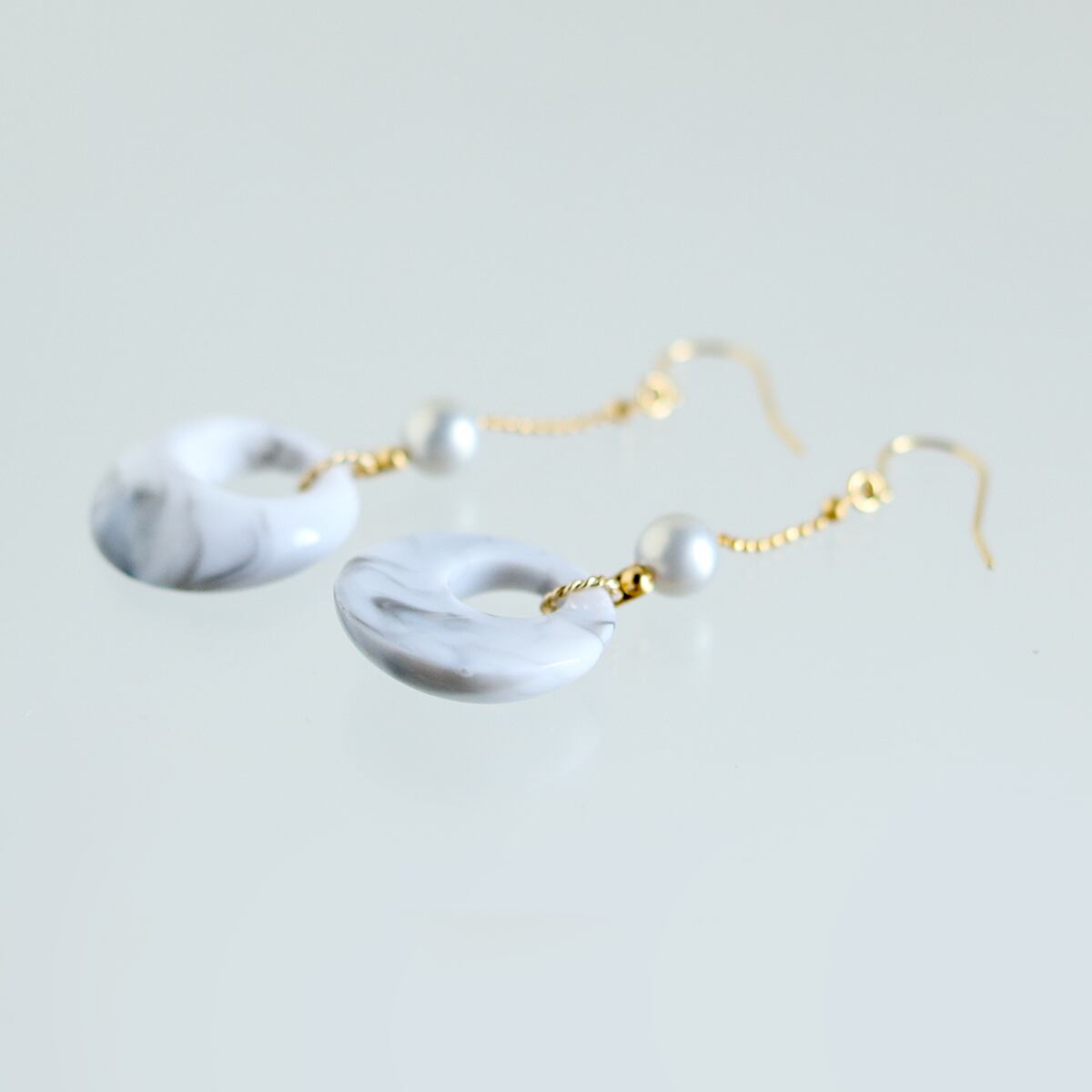 月の輪マーブルとパールのピアス(ホワイト)/p1629