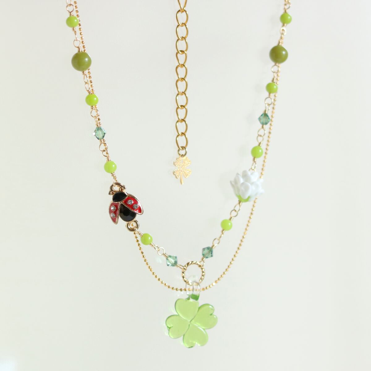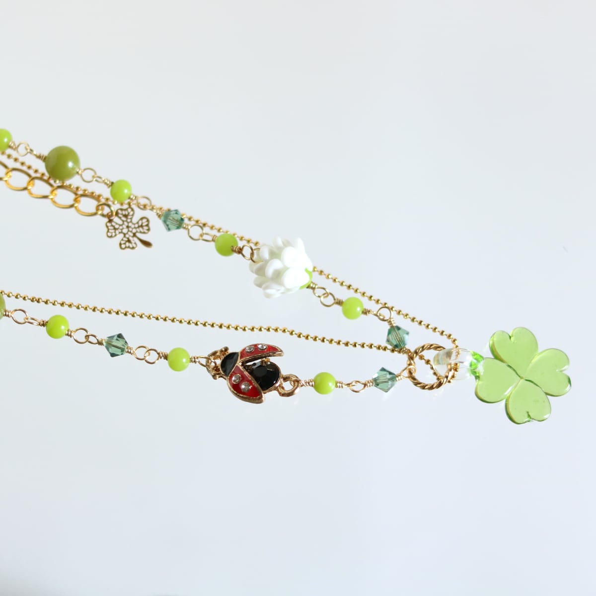 透明感のあるガラスの四葉クローバーが胸元でそっと輝くネックレスです。