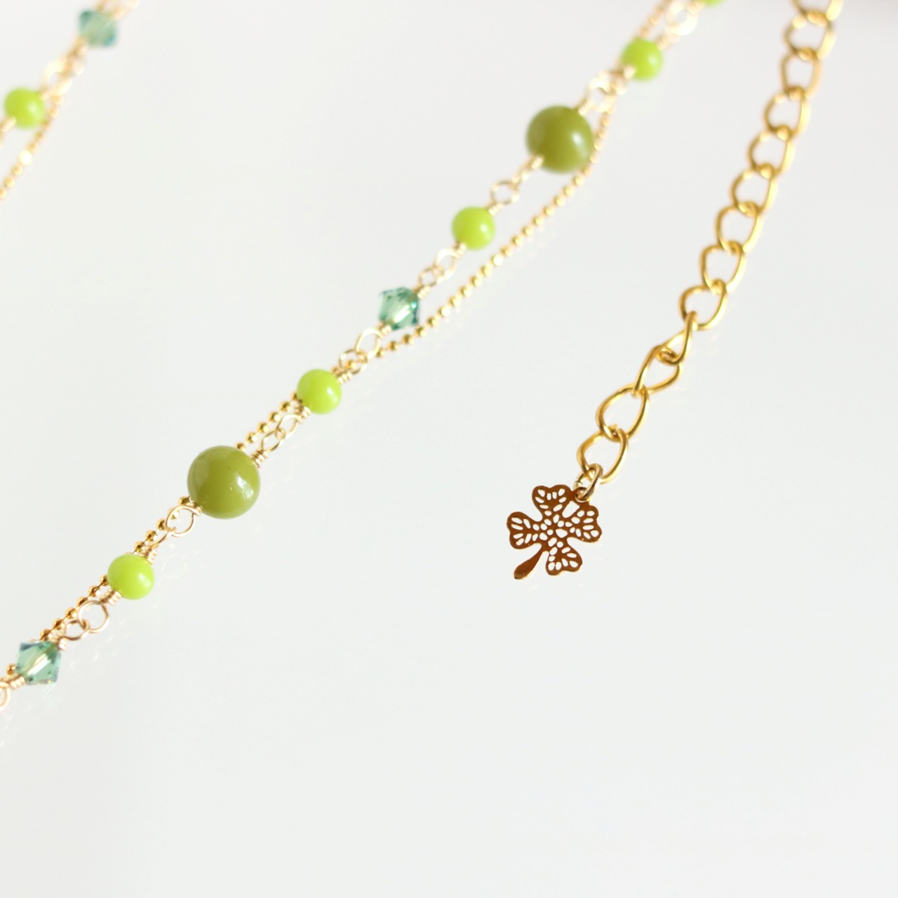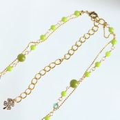 チェーン部分には、日本製ヴィンテージビーズの優しいオリーブ色とライトグリーン、