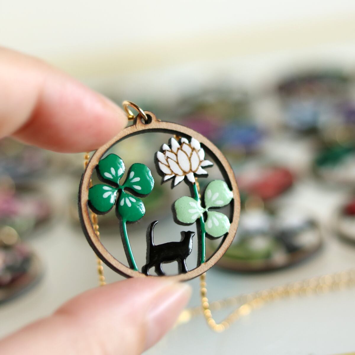 レーザー加工で形を作り、ひとつひとつ手作業で着色、着色部分は樹脂でぷっくりつややかに。
