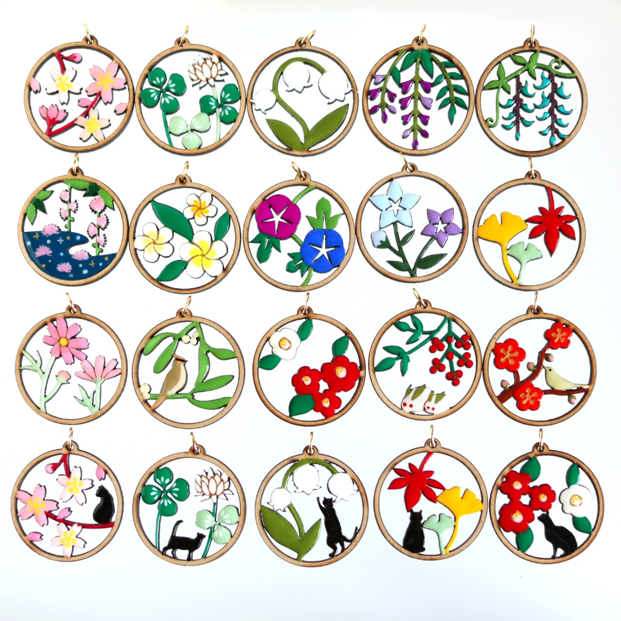 レーザー加工で形を作り、ひとつひとつ手作業で着色、着色部分は樹脂でぷっくりつややかに。