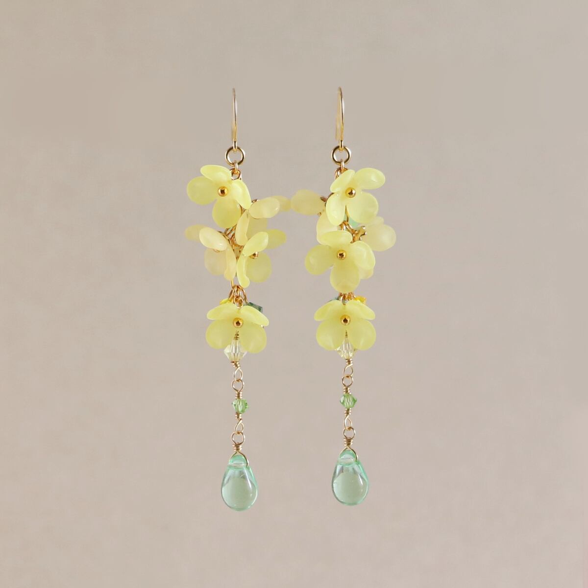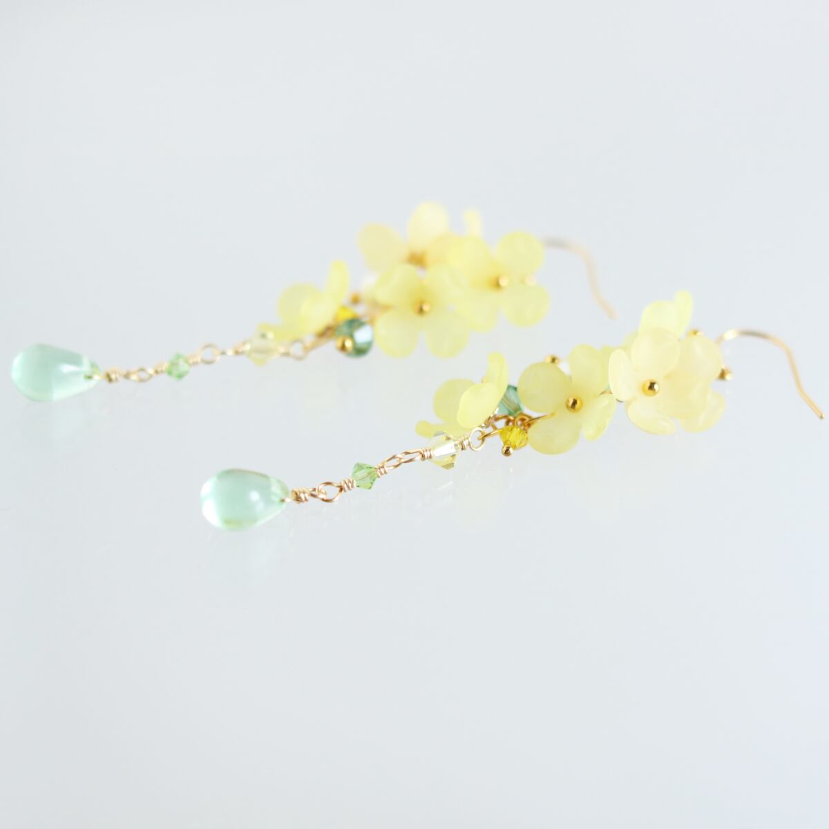 花の合間にパールや淡いグリーンのチェコビーズ、更に下に連ねて濃淡を混ぜてグリーン系、イエロー系のスワロフスキークリスタルを、一番下に揺れるのはペリドットカラーのチェコガラスビーズのドロップ。