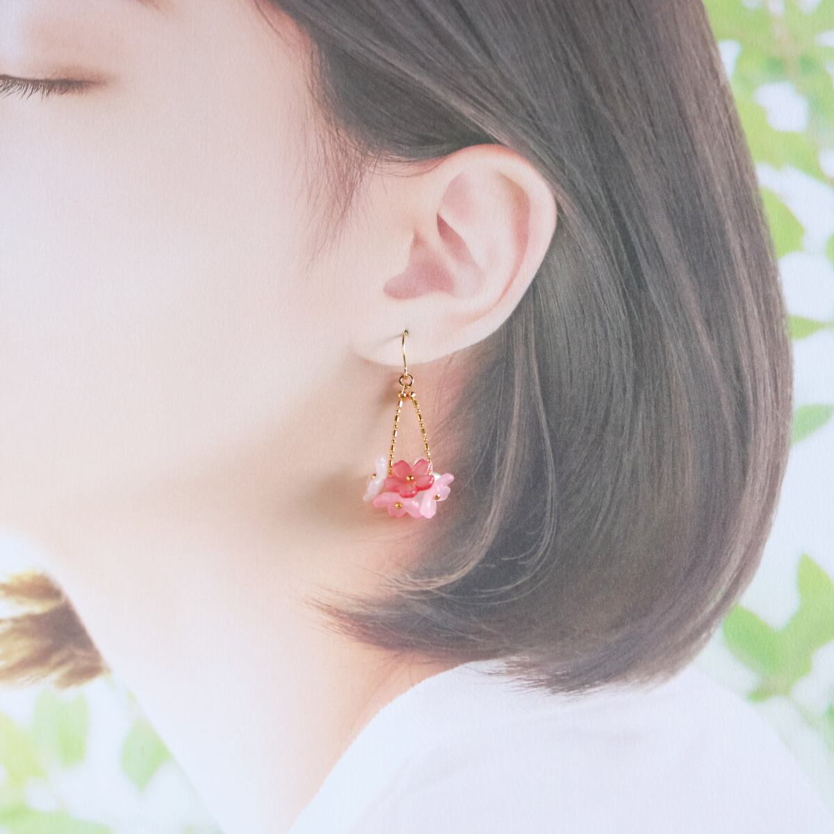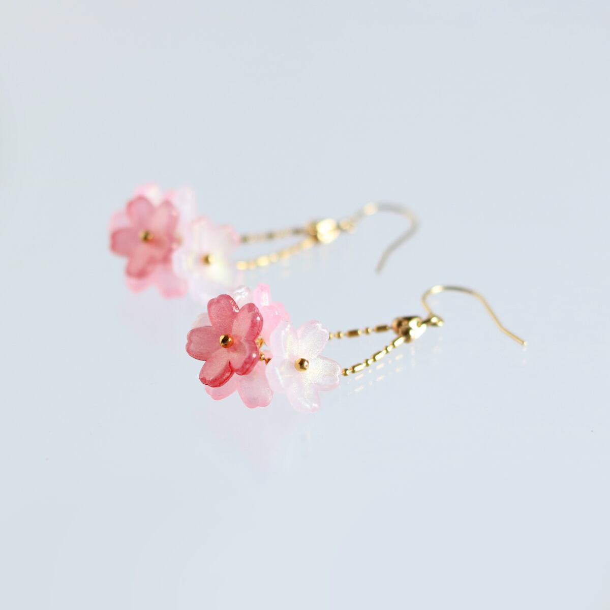 濃淡の異なるピンクの桜が、耳元でやさしく咲くピアスです。