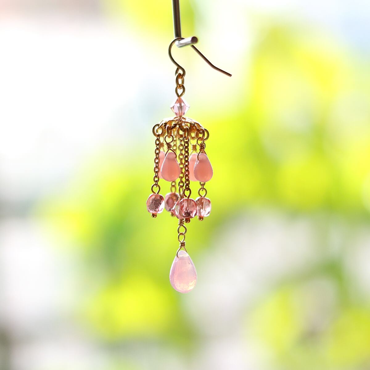 チェコガラスビーズのドロップやスワロをチェーンやワイヤーで丁寧につなげています。