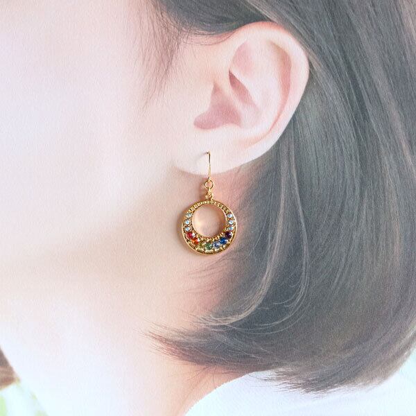 レインボーカラーのスワロのラインストーン七色をひと粒ずつフレーム中央にセット、両サイドにはクリスタルAB(オーロラ)。