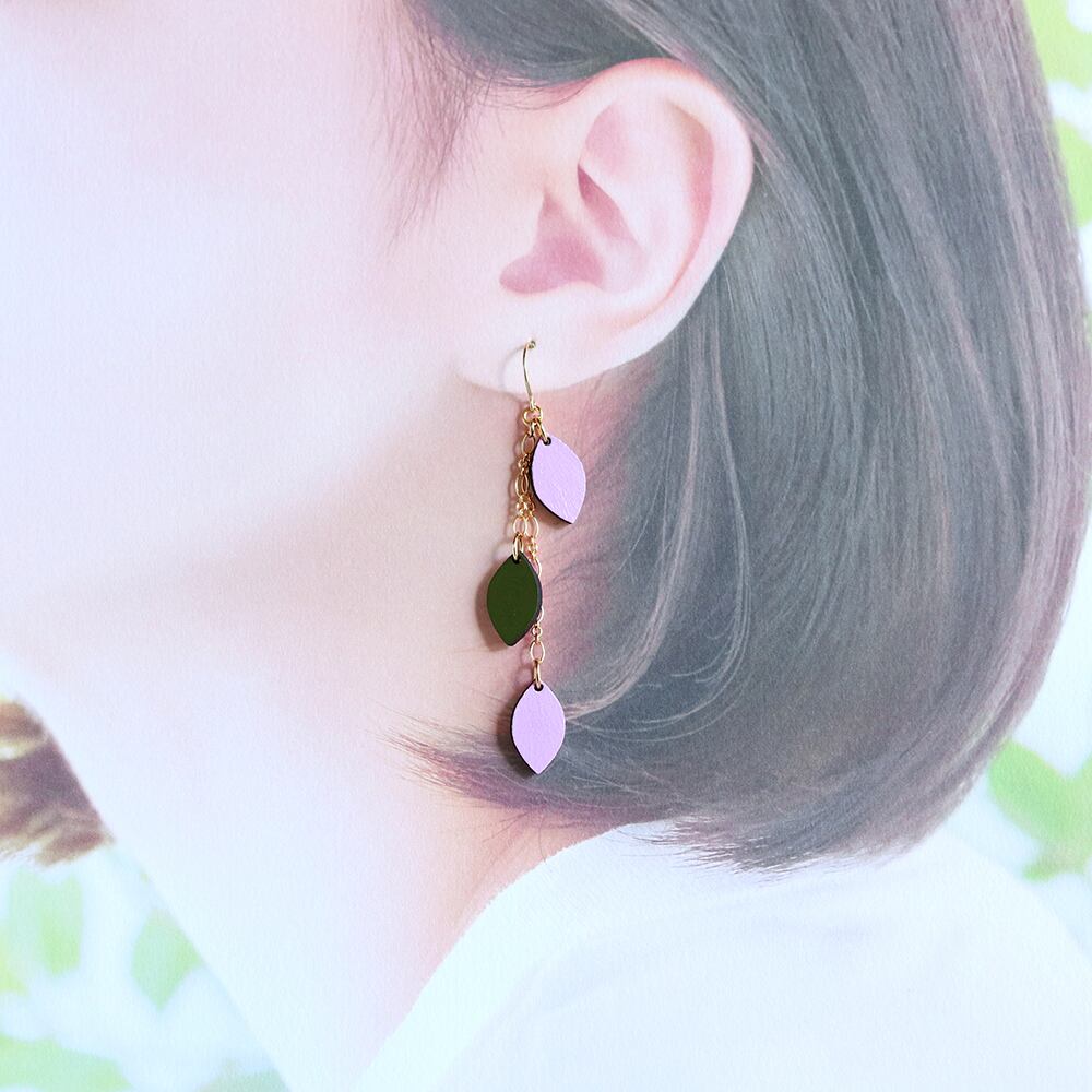 桐始結花のピアスは、桐の花のピンクと紫の中間色に、濃い葉の色の2色で表現しました。