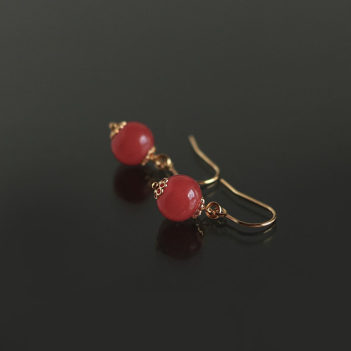 ビーズは約8mm、お色は天然石のカーネリアンやレッドアゲートを模したような、赤とオレンジの中間のような色になっています。