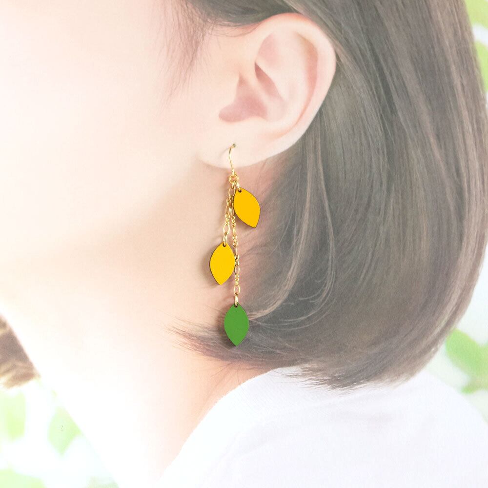 ピアスは、柑橘の葉と実の色とをイメージした配色にしました。