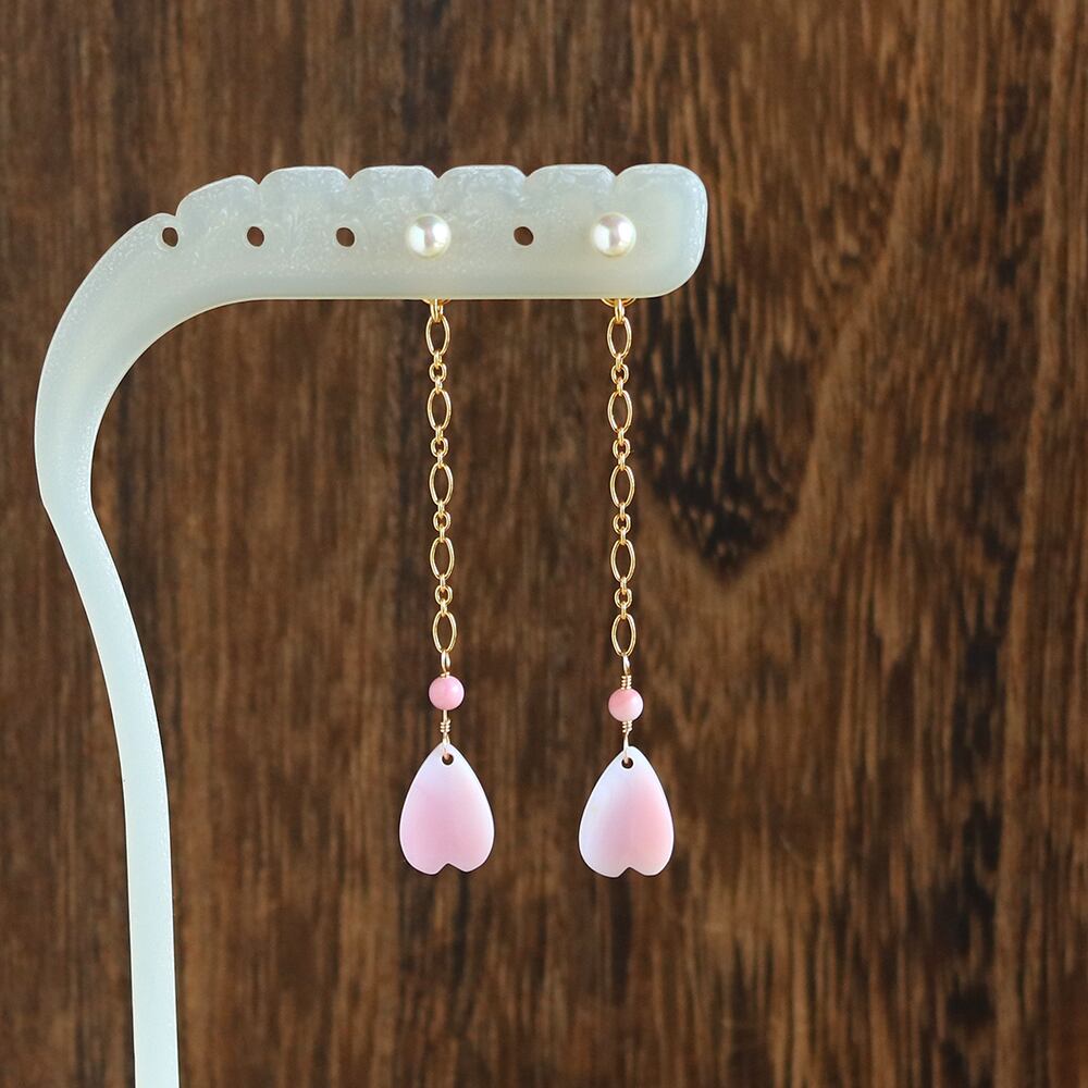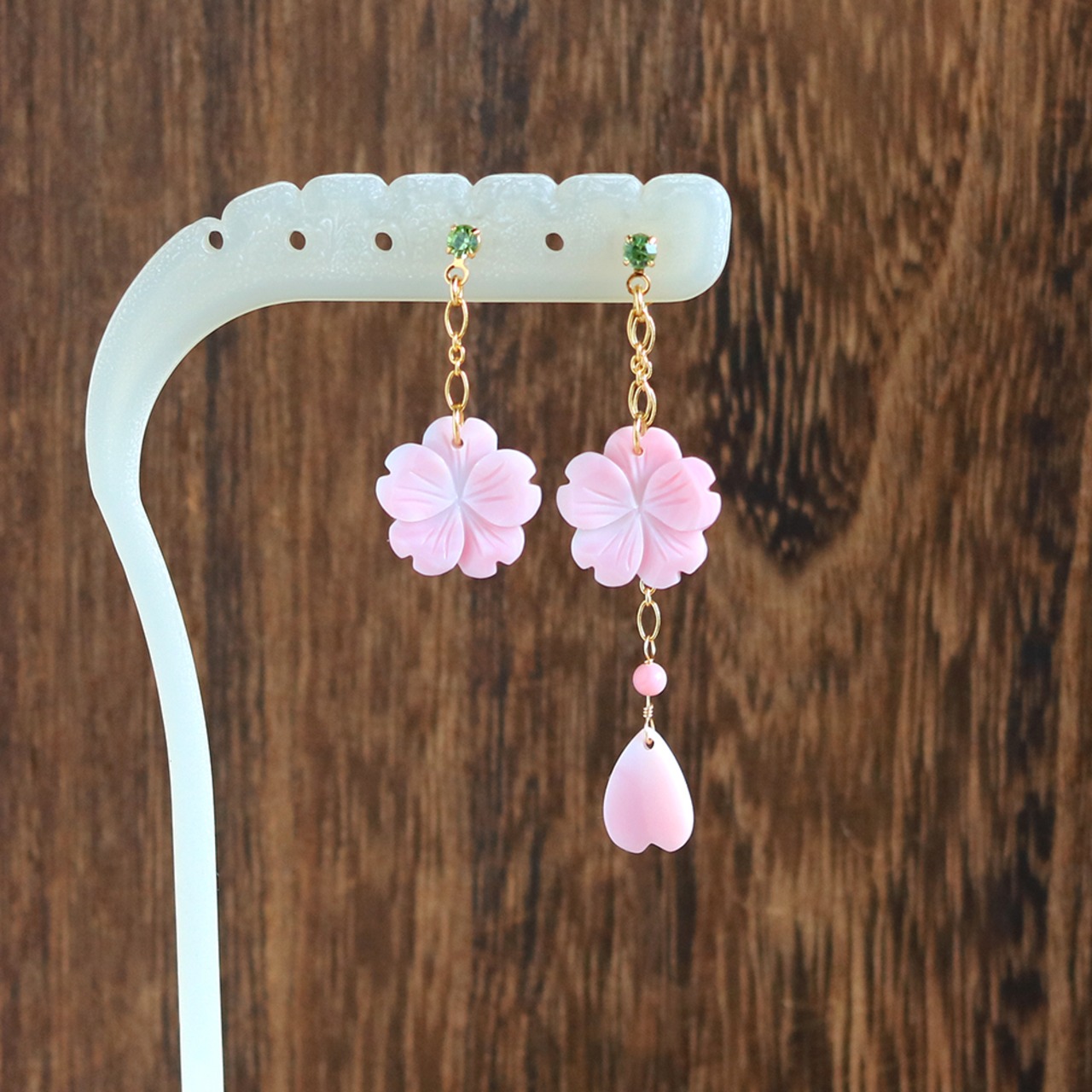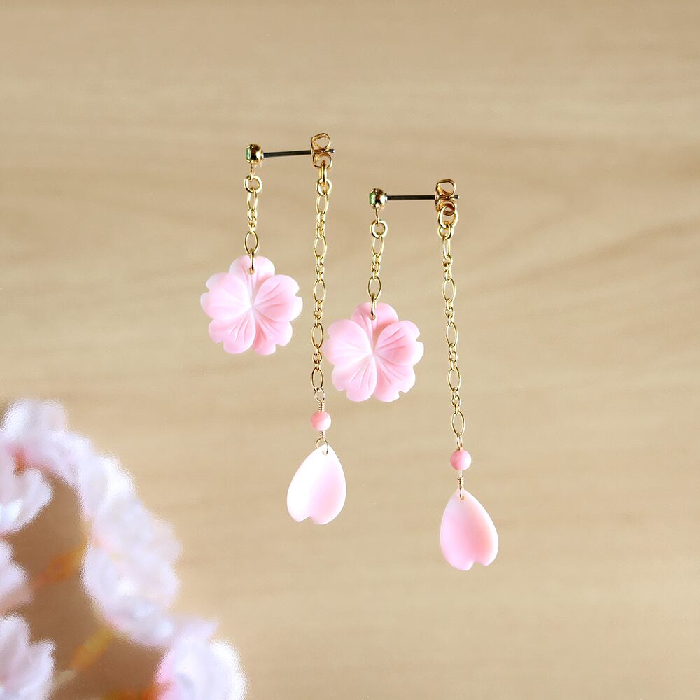 【さくら、咲く】桜の花と花びらが舞う2wayピアス・クイーンコンクシェル/p1272