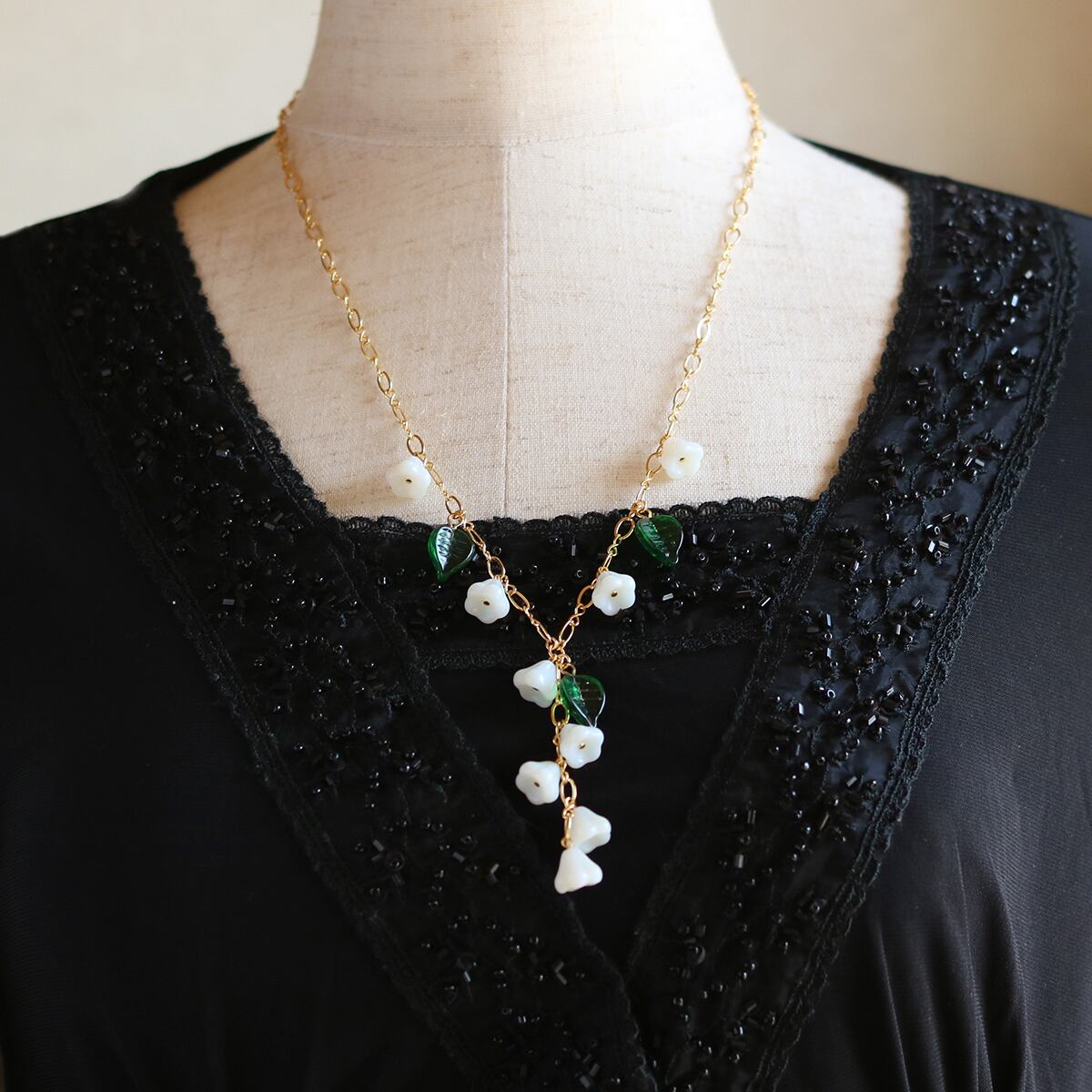 チェコガラスビーズのベルフラワーを、すずらんに見立てたネックレスです。